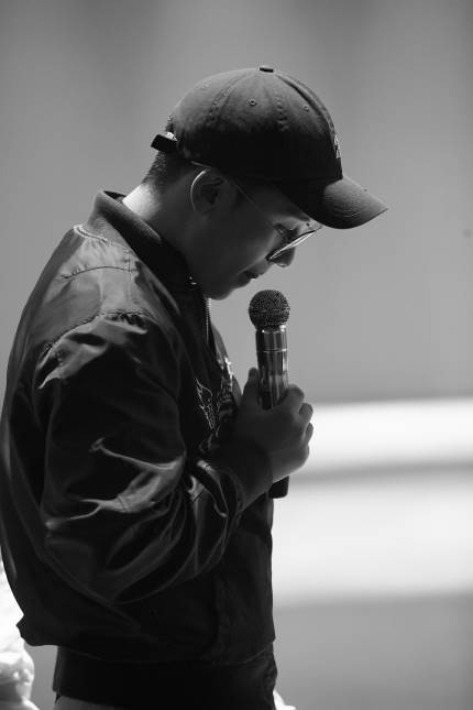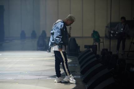 TAEYANG preparing his individual performance with the band. Good looks Bro! He is showing his serious side, constantly checking the acoustics.
