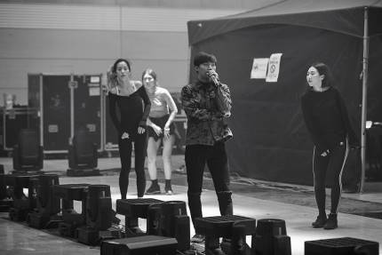 He is checking choreography with the dancers for a perfect performance.