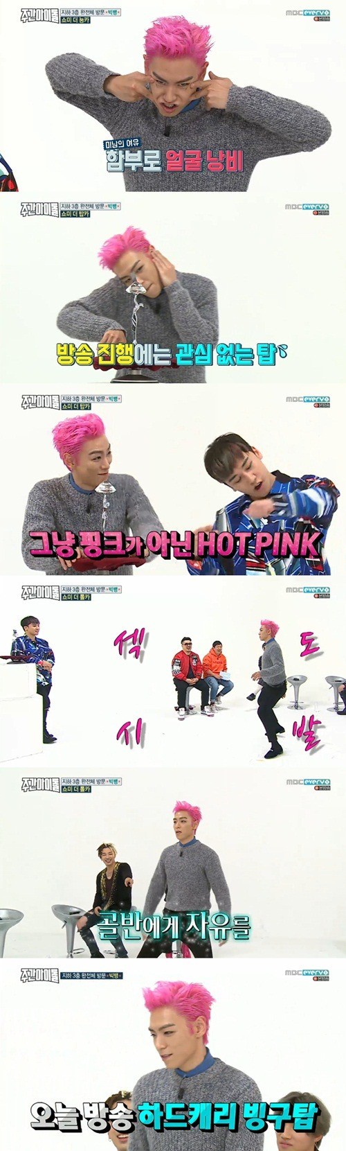 The second BIGBANG episode of MBC Every1’s “Weekly Idol”show was aired on January 11. All the BIGBANG members heated up the atmosphere in the studio located on the third basement floor, with their outstanding sense of humor. Notably, the eldest member T.O.P made everyone burst into laughter, showing big excitement to the extent to be called “maniac”.