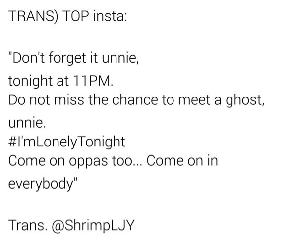 [Photo] T.O.P IG September 16, 2015 at 08:45PM (KST) 잊지마 언니, 오늘 봠 11시 귀신을 만날 기회를 놓치지마 언니 #나오늘밤외로워요 오빠들도 커몬… 다 드루와