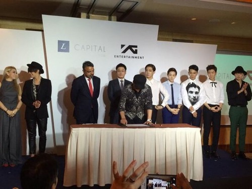 G-Dragon with CL, Winner, Yang Hyun Suk, and Yang Min Suk at the contract signing ceremony of YG Entertainment and L Capital Asia (Louis Vuitton’s private equity firm) held at Ritz Carlton Singapore on September 13